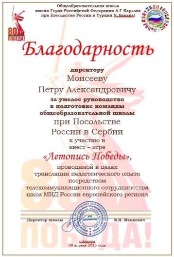 2015-2016 УЧЕБНЫЙ ГОД МУЗЫКАЛЬНО-ТЕАТРАЛЬНЫЙ ФЕСТИВАЛЬ «МИДОВСКИЕ ЗВЕЗДОЧКИ» НОМИНАЦИЯ «ПОЮЩАЯ ШКОЛА» Руководитель – Айсина Анна Николаевна Участник – Кильдяшова Алиса, ученица 2 класса Возрастная группа – 1-4 классы Песня «Золушка» НОМИНАЦИЯ «ПОЮЩАЯ ШКОЛА» Руководитель – Глебов Лев Леонидович Вокальный ансамбль «Консонанс» Участники: Огурцова Дарья Коробова Людмила Ябланович Екатерина Возрастная группа – 5-8 классы Песня «Ой, заря, ты зорюшка» НОМИНАЦИЯ «ПОЮЩАЯ ШКОЛА» Руководитель – Глебов Лев Леонидович Участник – Костев Виктор Возрастная группа – 9-11 классы Песня «Салют Весне!» НОМИНАЦИЯ «ЗОЛОТАЯ ТУФЕЛЬКА» Хореограф - заслуженный работник культуры Еремеева Любовь Анатольевна Участник – Михайлович Аня, ученица 3 класса Возрастная группа – 1-4 классы Танец «Арлекино» НОМИНАЦИЯ «ЗОЛОТАЯ ТУФЕЛЬКА» Хореограф - заслуженный работник культуры Еремеева Любовь Анатольевна Танцевальный ансамбль «Росинка» Участники: Больбух Екеатерина, 7 кл. Шубарич Христина, 7кл. Обрадович Екатерина, 6кл. Иванова Мария, 5 кл. Возрастная группа – 5-8 классы Танец «Русский сувенир» НОМИНАЦИЯ «ЗОЛОТАЯ МАСКА» Руководитель Девятова Елена Алексеевна Участники: Гусева Мария Витер Андрей Малышева Александра Станкович Арсений Борисова Мария Горшков Алексей Михайлович Ана Айсина Виолетта Кутырина Виктория Возрастная группа – 1-4 классы «Новогодние приключения Маши и Вити» НОМИНАЦИЯ «ЗОЛОТАЯ МАСКА» Руководители: Козырева Елена Николаевна, Сыроватская Елена Викторовна Участники: Огурцова Дарья, 8 кл. Паришев Калоян, 7 кл. Самарджич Алекса, 8 кл. Стойкович Анастасия, 8 кл. Коробова Людмила, 7 кл. Больбух Екатерина, 7 кл. Шубарич Христина, 7 кл. Возрастная группа – 5-8 классы «Моя прекрасная леди» (Б.Шоу) НОМИНАЦИЯ «ЗОЛОТАЯ МАСКА» Руководитель – Иванова Лариса Александровна Участники: Борисова Анастасия, 11 кл. Фатеев Кирилл, 11 кл. Мордвинов Егор, 11 кл. Возрастная группа – 9-11 классы А.П.Чехов «Злой мальчик» НОМИНАЦИЯ «ЮНЫЙ МУЗЫКАНТ» Участник – Павлович Латисия Возрастная группа – 1-4 классы «Этюд», композитор К.Лешгорн НОМИНАЦИЯ «ЮНЫЙ МУЗЫКАНТ» Участник – Динич Стефан, ученик 7 класса Возрастная группа – 5-8 классы Пьеса «Примавера», композитор А.Г.Абриль НОМИНАЦИЯ «ЮНЫЙ МУЗЫКАНТ» Участник – Станкович Милан, ученик 9 класса Возрастная группа – 9-11кл Пьеса «Инвенция № 1» И.С.Бах. ========================================================= Подведены итоги сетевого проекта "Красота своими руками", проводимого среди заграншкол МИД (организатор – школа в Финляндии). В номинации "Аппликация" работа обучающейся нашей школы Борисовой Марии «Сказочная хохлома» 3 класс (учитель Вранич С.В.) заняла 1-е место.