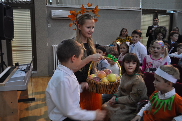 21.11.2014. ПРАЗДНИК ОСЕНИ Осенний праздник собрал учеников начальной школы, их родителей и педагогов в актовом зале школы 21-ого ноября. Каждый класс подготовил и показал свою сценку: первый класс – «Репку», второй – «Подготовка к зиме», третий – «Как лисичка осень встречала», четвертый – «Спор овощей». Еще второклассники исполнили замечательный танец цветов. Украсили праздник песни в исполнении сводного хора и ансамбля первоклассников, танцы ансамбля «Росинка»: «Дождик» и «Лесной олень». А помогли создать праздничное настроение сказочные персонажи и настоящие ведущие. В гостях у малышей были сестрицы: Лето, Осень, Зима, Весна. Неожиданно появились Слякоть и Холодрыга. И все это – ребята из шестого и седьмого классов. Осень была в сопровождении братьев, осенних месяцев, в исполнении учеников четвертого класса. Зрители смогли отгадать осенние загадки и получили чудесные подарки – корзины спелых, сочных, красивых яблок.