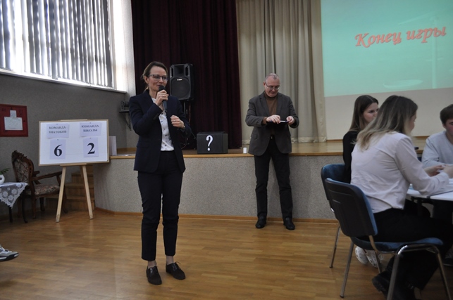 12.02.2024. Игра «Что? Где? Когда?» Проведение интеллектуальных мероприятий стало традицией в нашей школе. В преддверии большого праздника - Дня дипломатического работника - в качестве поздравления силами школы была организована игра «Что? Где? Когда?». За победу боролась сборная команда знатоков, в состав которой вошли сотрудники Посольства и старшеклассники. Против них выступили учащиеся школы и учителя, заранее подготовившие интересные вопросы. Всё было, как в настоящей телевизионной игре: вопросы, музыкальные паузы, знакомые звуковые заставки… И команда боролась за победу по-настоящему. Все вопросы были разнообразны, но особый интерес у игроков и зрителей вызвали «Черный ящик» и «Музыкальная пауза». Интеллектуальная борьба принесла массу эмоций участникам. Все хотели показать высокий уровень знаний и мастерство решения нестандартных задач. Старшеклассники учились работать в команде, уважать и учитывать мнение других, брать на себя ответственность и совместными усилиями добиться успеха, а взрослые участники команды, дипломаты, с большим удовольствием помогали им. Игра прошла очень оживленно и эмоционально. В итоге выиграла команда знатоков, но, строго говоря, победителями стали все участники, так как получили удовольствие от увлекательной игры.
