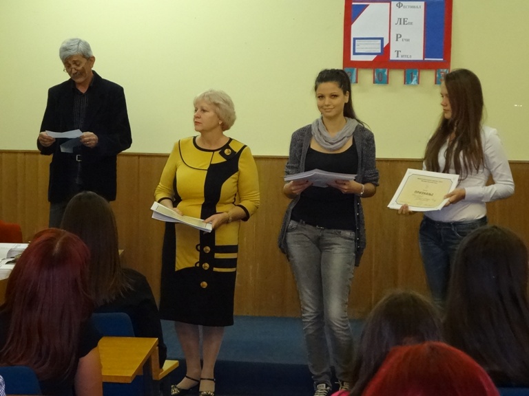 23.09.2013. Весной этого года Обществом сербско-русского единства проводился очередной литературный конкурс для учеников и студентов «Фестиваль красивого слова Тител 2013» или «FLERT 2013». Организаторы конкурсной программы предложили и нашей школе принять участие в этом состязании. На конкурс были поданы две работы наших учащихся: эссе «Прогулки по Белграду» ученицы тогда еще 8 класса Ябланович Анастасии (руководитель – Сметанкина Ольга Николаевна) и эссе «…Не расставайтесь с надеждой, маэстро…» ученика 9 (сейчас – 10-ого) класса Лойпура Виктора (руководитель – Андреева Елена Витальевна). И вот подведены итоги, и 21-ого сентября в ознаменование Европейского дня языка в Голубом зале Суда г. Тител состоялось награждение финалистов и победителей конкурса. Мы с удовольствием поздравляем наших участников и их руководителей! Анастасия стала финалисткой и призером конкурса, а Виктор (видимо, оправдывая свое имя) – его победителем! Желаем им новых достижений и побед! |