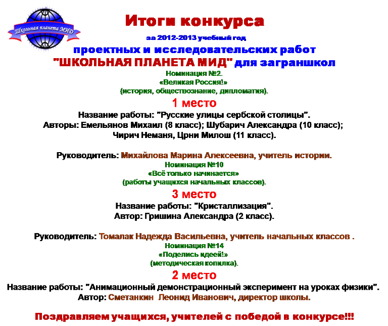 26.04.2013. Итоги конкурса за 2012-2013 учебный год "Школьная планета МИД" Смотреть... Школа при Посольстве России в Сербии принимала участие в 6 номинациях. Участвовать можно было только в 6 номинациях из 14 возможных.
