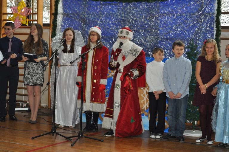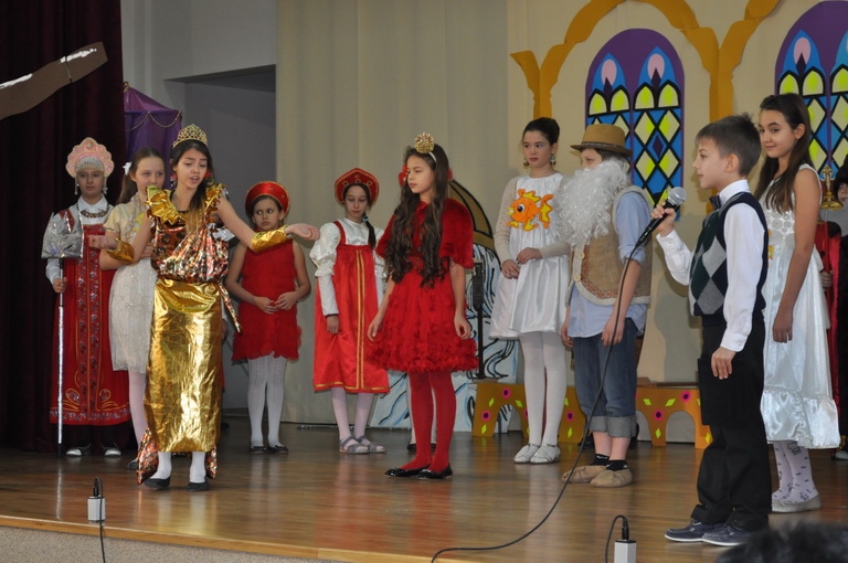 29.12.2014. КАК МЫ ВСТРЕТИЛИ НОВЫЙ ГОД В последний день перед зимними каникулами школа погрузилась в праздничную предновогоднюю атмосферу. Великолепная лесная красавица-елка (самая настоящая, живая, пахнущая Новым годом и сказкой!) встретила учеников начальной школы в спортивном зале, куда их пригласили ведущие, сказочные персонажи, Дед Мороз и Снегурочка. Загорелись огни на елочке, зазвучала музыка, и закружился хоровод! А еще были игры, шутки, песни, танцы и подарки от Дедушки Мороза. И это только начало! После игровой программы (уже в актовом зале) собрались не только малыши, но и ученики 5-х, 6-ого и 7-ого классов. Были приглашены также родители и педагоги. Все ждали традиционное театрализованное представление. В этот раз, когда заканчивается год культуры и ему на смену приходит год литературы, оно называется «Новогоднее путешествие Алисы и Андрея по сказкам Пушкина». И вот уже в первые минуты на сцене сам Александр Сергеевич в исполнении Виктора Лойпура. Перо в руках поэта, таинственная музыка и всем известные, но оттого не менее любимые, строки: У Лукоморья дуб зеленый, Златая цепь на дубе том. И днем, и ночью кот ученый Все ходит по цепи кругом… И действительно, по сцене проходит кот, важный и оооочень ученый! А за ним Леший, Русалка, Баба Яга, Кащей, Богатырь, Чародей… и все остальные. Сказка начинается… Алиса и Андрей (Алиса Кильдяшова, ученица 1-ого класса, и второклассник Андрей Виттер) должны помочь сказочным героям победить зло, потому что лишь тогда наступит Новый год. И вот весь зал вместе с актерами, учениками нашей школы с первого по одиннадцатый класс, попадают в сказки А.С. Пушкина и в его сказочную поэму «Руслан и Людмила». Дети помогают Руслану сразиться сначала с говорящей головой, а затем и с самим Черномором, чтобы освободить Людмилу. Потом они выручают старика из «Сказки о рыбаке и рыбке», находят Золотого петушка, чтобы царь Дадон освободился от чар Шамаханской царицы, и, наконец, вместе с царем Салтаном приезжают на корабле в «царство славного Гвидона», где обманщицы Ткачиха, Повариха и Старуха Бабариха «повинились и признались» в своих злодеяниях, посему были прощены и отпущены, а семья царя Салтана воссоединилась. И все это благодаря знанию сказок, а не компьютерным героям, которых пытался призвать на помощь Андрей. Даже компьютерные Спам, Глюк и Вирус, попробовав помочь сказочным героям (это именно они вернули Золотого петушка), признались, что им даже понравилось быть добрыми. Путешествие закончилось – Добро торжествует над Злом! Значит, Новый год наступит! Алиса радуется. Но кто это трясет ее за плечо? Что ей говорит Андрей? «Алиса, проснись! Скоро Новый год!» Так это был сон!!! Но что это за злобные голоса? Угрозы? Директора в плен хотят забрать? Праздник испортить? Да это же Баба Яга и ее помощники, а с ними Снежная королева! Сказка продолжается. На сцене появляются Снегурочка, Дед Мороз, который заблудился в школе, пока шел из спортивного зала в актовый, Новый год. И «злодеи» уже тоже хотят вместе со всеми веселиться на празднике. А раз праздник – надо их простить! И звучит финальная песня в исполнении всех участников спектакля. Вот так, благодаря общим усилиям взрослых, которые писали сценарий, осуществляли постановку представления, проводили репетиции (Глебов Лев Леонидович, зам. директора по воспитательной работе, 