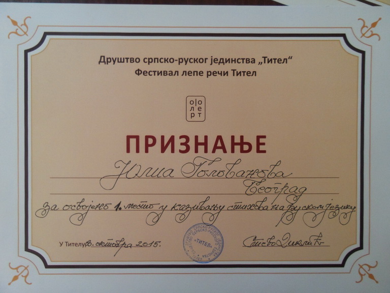 03.10.2015. ФЕСТИВАЛЬ «ФЛЕРТ-2015» В г.Тител состоялся конкурс выразительного чтения стихотворений на русском языке. Это было завершающее мероприятие литературного Фестиваля красивого слова Тител–2015 «FLERT—2015», который проводит общество сербско-русского единства «Тител». Нынешний конкурс чтецов был посвящён 120-летию со дня рождения великого русского поэта Сергея Есенина и не случайно прошёл 3 октября – в день рождения поэта. Ученики сербских школ и студенты гимназий читали стихотворения и поэмы Есенина на русском языке, пели песни и романсы на его стихи. Нашу школу представляла группа обучающихся 6 - 10 классов: Круглова Софья, Мокрова Алина, Хаткевич Анна, Бабкина Эвелина, Голованова Юлия, Огурцова Дарья, Райчич Михаил, Карабицкая Анастасия. В этот солнечный день золотой осени особенно проникновенно звучали есенинские строки о Родине, родной природе, русской деревне. Все наши ребята прекрасно выступили и были отмечены жюри: награждены грамотами и дипломами. Победителем в своей возрастной группе стала Голованова Юлия, ученица 7 класса (учитель – Глебова М. А.). В русском костюме, весело и задорно прочла Юля стихотворение Есенина «Плясунья», вызвав восторг зрителей и жюри. Второе и третье место в этой возрастной группе тоже заняли ученицы нашей школы: Мокрова Алина и Хаткевич Анна, ученицы 6Б класса (учитель Иванова Л.А.). В своей возрастной группе отмечен дипломом победителя Райчич Михаил, ученик 9 класса (учитель Иванова Л.А.). Мы получили огромное удовольствие от выступления сербских школьников, которые показали себя истинными любителями поэзии Есенина. Так что с победой можно поздравить всех! Такие литературные встречи обогащают нас духовно и побуждают к новым творческим поискам.