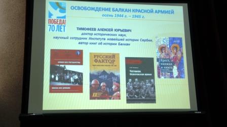 27.03.2015. ВСТРЕЧА С ДОКТОРОМ ИСТОРИЧЕСКИХ НАУК ТИМОФЕЕВЫМ А.Ю. Встречи с интересными людьми являются хорошей традицией нашей школы. Классный руководитель 8 класса Генералова Оксана Борисовна и библиотека школы стали инициаторами встречи 7-10 классов с Тимофеевым Алексеем Юрьевичем - доктором исторических наук, научным сотрудником Института новейшей истории Сербии, представителем Российского института стратегических исследований в Сербии, автором нескольких книг о первой и второй мировой войнах на Балканах. Объединенный классный час 27 марта 2015 года открыл Генералов Андрей (9 класс): «Наша встреча посвящена сегодня истории. Один из героев фильма «Большая перемена» очень верно сказал: «История - это как бы биография человечества». А свою биография надо хорошо знать и помнить, чтобы ни у кого не было желания ее переписать; чтобы не прерывалась связь времен и поколений; чтобы мы, которым предстоит творить эту историю в самом ближайшем будущем, хорошо поняли слова Карамзина о том, что прошлое – это «изъяснение настоящего и пример будущего». И сегодня, когда до юбилея Дня Победы остается меньше двух месяцев, у нас с вами есть возможность вернуться к тем событиям, которые происходили в этой стране, на этой земле 70 лет назад.» Тема выступления Тимофеева А.Ю. - «Освобождение Балкан Красной Армией в 1944-1945 годах.» Алексей Юрьевич подробно рассказал ребятам о знаменитом полководце, Маршале Советского Союза Толбухине Федоре Ивановиче, под руководством которого проводилась операция по освобождению Балкан.