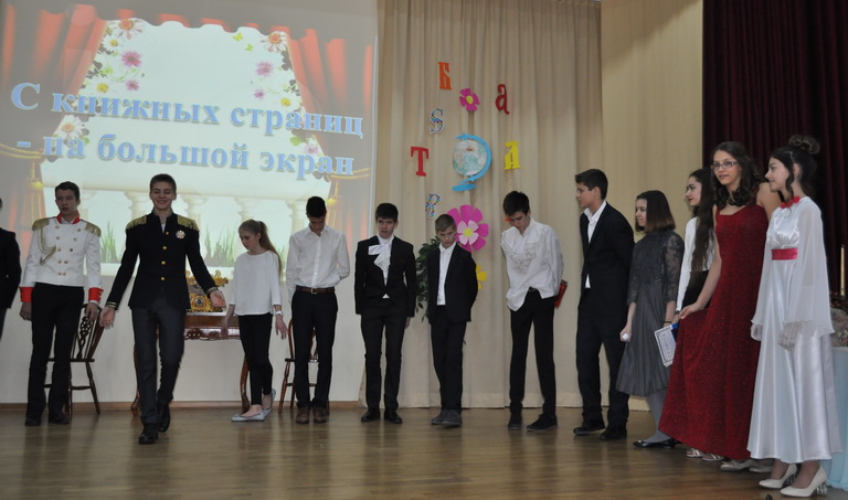 25.11.2016. «С КНИЖНЫХ СТРАНИЦ – НА БОЛЬШОЙ ЭКРАН» Году российского кино было посвящено мероприятие «С книжных страниц – на большой экран» (руководители – Глебова М.А. и Глебов Л.Л.) Оно закрывало неделю предметов гуманитарного цикла. Действие началось у парадной лестницы, по которой и поднялись в актовый зал учителя и участники программы. А затем на сцене развернулись картины из «Войны и мира», «Бесприданницы», «Маскарада», «Макара Чудры», «Юноны и Авось» и даже современного романа «Трое из навигацкой школы». А на экране мелькали кадры из фильмов, поставленных по этим литературным произведениям: «Война и мир», «Жестокий романс», «Маскарад», «Табор уходит в небо», «Юнона и Авось», «Гардемарины, вперед!». Бальные платья, костюмы, парадные мундиры, бабочки, жабо и маскарадные маски помогали зрителям перенестись в те далекие времена. Истинным украшением праздника стали романсы в исполнении солистов ансамбля «Консонанс».