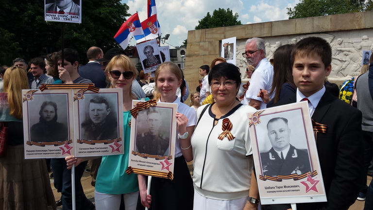 09.05.2016. АКЦИЯ «БЕССМЕРТНЫЙ ПОЛК» 9 мая, в День Победы, педагоги, родители и ученики нашей школы приняли участие в церемонии возложения цветов к могилам воинов, павших во время Второй мировой войны, и в акции «Бессмертный полк». Более полутора тысяч человек, русских и сербов, несли в руках фотографии своих близких, проходя по центральным улицам Белграда. В марше участвовали ветераны Второй мировой из разных стран: России, Сербии, Белоруссии, Азербайджана, Казахстана; представители дипломатических миссий, в том числе, посол Белоруссии Владимир Чушев с супругой,члены Правительства Сербии и мэрии Белграда, видные общественные деятели: министр труда Александр Вулин, лидер Сербской народной партии Ненад Попович, глава движения "Двери" Бошко Обрадович и экс-министр обороны страны Братислав Гашич, представители казачества и байкерского движения «Ночные волки». В конце шествия, у Русского дома в Белграде, «Бессмертный полк» встретил Чрезвычайный и Полномочный Посол РФ в Сербии Александр Чепурин. Александр Васильевич обратился к собравшимся с проникновенной речью, поздравив всех с великим и святым праздником – Днём Победы.
