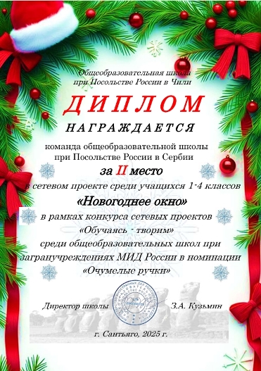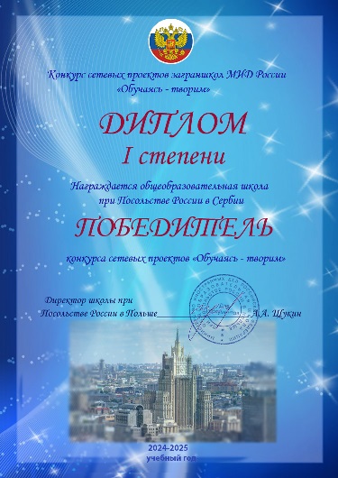 2015-2016 УЧЕБНЫЙ ГОД МУЗЫКАЛЬНО-ТЕАТРАЛЬНЫЙ ФЕСТИВАЛЬ «МИДОВСКИЕ ЗВЕЗДОЧКИ» НОМИНАЦИЯ «ПОЮЩАЯ ШКОЛА» Руководитель – Айсина Анна Николаевна Участник – Кильдяшова Алиса, ученица 2 класса Возрастная группа – 1-4 классы Песня «Золушка» НОМИНАЦИЯ «ПОЮЩАЯ ШКОЛА» Руководитель – Глебов Лев Леонидович Вокальный ансамбль «Консонанс» Участники: Огурцова Дарья Коробова Людмила Ябланович Екатерина Возрастная группа – 5-8 классы Песня «Ой, заря, ты зорюшка» НОМИНАЦИЯ «ПОЮЩАЯ ШКОЛА» Руководитель – Глебов Лев Леонидович Участник – Костев Виктор Возрастная группа – 9-11 классы Песня «Салют Весне!» НОМИНАЦИЯ «ЗОЛОТАЯ ТУФЕЛЬКА» Хореограф - заслуженный работник культуры Еремеева Любовь Анатольевна Участник – Михайлович Аня, ученица 3 класса Возрастная группа – 1-4 классы Танец «Арлекино» НОМИНАЦИЯ «ЗОЛОТАЯ ТУФЕЛЬКА» Хореограф - заслуженный работник культуры Еремеева Любовь Анатольевна Танцевальный ансамбль «Росинка» Участники: Больбух Екеатерина, 7 кл. Шубарич Христина, 7кл. Обрадович Екатерина, 6кл. Иванова Мария, 5 кл. Возрастная группа – 5-8 классы Танец «Русский сувенир» НОМИНАЦИЯ «ЗОЛОТАЯ МАСКА» Руководитель Девятова Елена Алексеевна Участники: Гусева Мария Витер Андрей Малышева Александра Станкович Арсений Борисова Мария Горшков Алексей Михайлович Ана Айсина Виолетта Кутырина Виктория Возрастная группа – 1-4 классы «Новогодние приключения Маши и Вити» НОМИНАЦИЯ «ЗОЛОТАЯ МАСКА» Руководители: Козырева Елена Николаевна, Сыроватская Елена Викторовна Участники: Огурцова Дарья, 8 кл. Паришев Калоян, 7 кл. Самарджич Алекса, 8 кл. Стойкович Анастасия, 8 кл. Коробова Людмила, 7 кл. Больбух Екатерина, 7 кл. Шубарич Христина, 7 кл. Возрастная группа – 5-8 классы «Моя прекрасная леди» (Б.Шоу) НОМИНАЦИЯ «ЗОЛОТАЯ МАСКА» Руководитель – Иванова Лариса Александровна Участники: Борисова Анастасия, 11 кл. Фатеев Кирилл, 11 кл. Мордвинов Егор, 11 кл. Возрастная группа – 9-11 классы А.П.Чехов «Злой мальчик» НОМИНАЦИЯ «ЮНЫЙ МУЗЫКАНТ» Участник – Павлович Латисия Возрастная группа – 1-4 классы «Этюд», композитор К.Лешгорн НОМИНАЦИЯ «ЮНЫЙ МУЗЫКАНТ» Участник – Динич Стефан, ученик 7 класса Возрастная группа – 5-8 классы Пьеса «Примавера», композитор А.Г.Абриль НОМИНАЦИЯ «ЮНЫЙ МУЗЫКАНТ» Участник – Станкович Милан, ученик 9 класса Возрастная группа – 9-11кл Пьеса «Инвенция № 1» И.С.Бах. ========================================================= Подведены итоги сетевого проекта "Красота своими руками", проводимого среди заграншкол МИД (организатор – школа в Финляндии). В номинации "Аппликация" работа обучающейся нашей школы Борисовой Марии «Сказочная хохлома» 3 класс (учитель Вранич С.В.) заняла 1-е место.